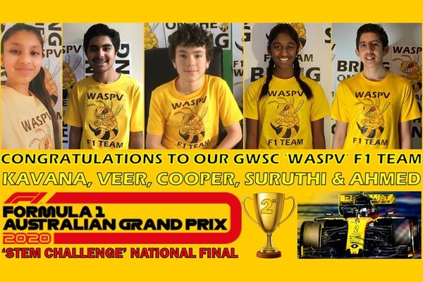 Congratulations to our GWSC ‘WASPV’ F1 Team who recently competed in the National Final of the 'Formula 1 Australian Grand Prix' STEM Challenge. Our ‘WASPV’ F1 Team consisted of Year 9 Research Science students - Kavana Gurukar, Suruthi Tharmaseelan, Ahmed Zahid, Cooper Monger and Veer Hira.